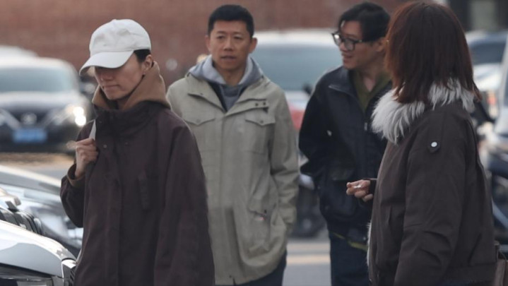 袁泉走在前头与好友轻声说笑。