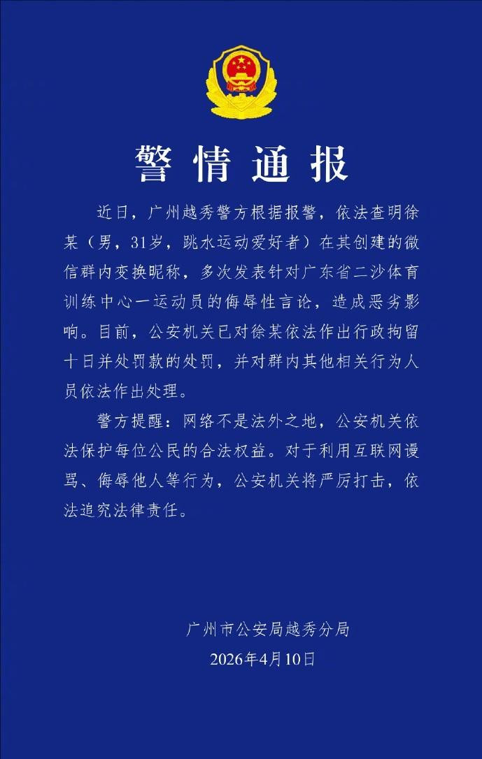 4月10日,警方正式通报,群主徐某被依法行政拘留十日,并处以罚款。