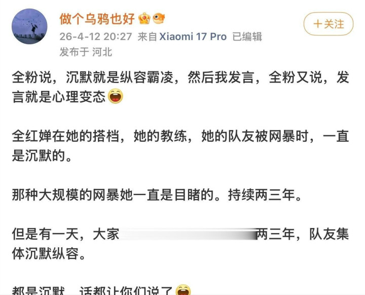 承受的伤害比全红婵还多,可全红婵却在这个时候沉默,纵容粉丝网暴他人。
